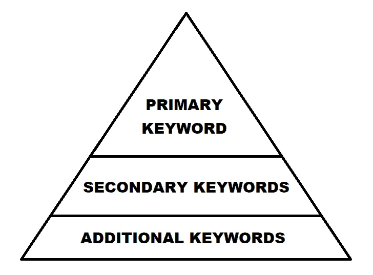 برای بهینهسازی، کلیدواژه اصلی باید در تمامی مکانهای مهم محتوا حضور داشته باشد، سپس کلیدواژههای ثانویه و در نهایت کلیدواژههای اضافی قرار گیرند. میتوانید این ساختار را بهصورت یک هرم تصور کنید که کلیدواژه اصلی در بالاترین بخش آن قرار دارد.
